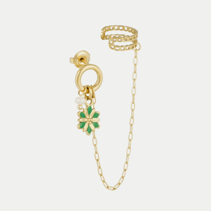 Voeg een opvallend en stijlvol accent toe aan je look met deze goudkleurige oorbel met ear cuff en groene bloem.