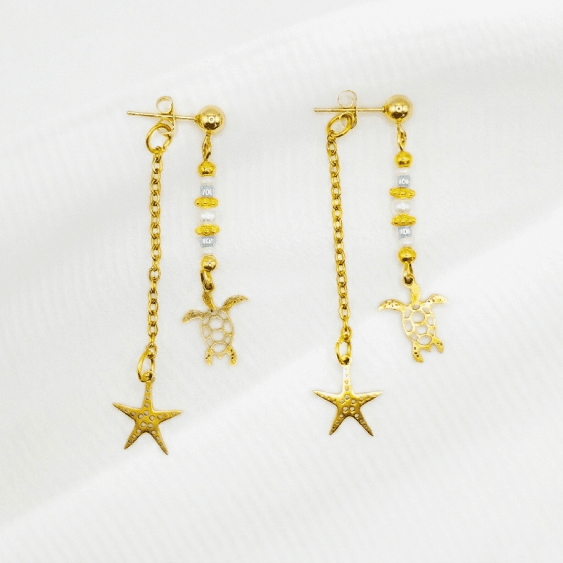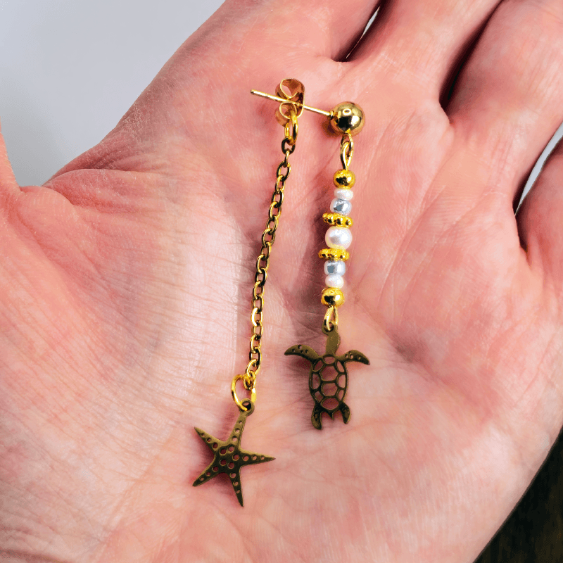 Wat deze oorbellen echt een fashion statement maakt, is het gedurfde, asymmetrische ontwerp. De ene hanger heeft een elegante gouden ketting met een zeester, terwijl de andere kant versierd is met kraaltjes in zachte wit- en blauwtinten die uitmonden in een sierlijke schildpad. Dit speelse lengteverschil geeft je ear party een moderne en unieke twist.