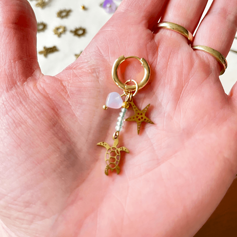 Details van deze oorringen met schildpad- & zeesterbedels: